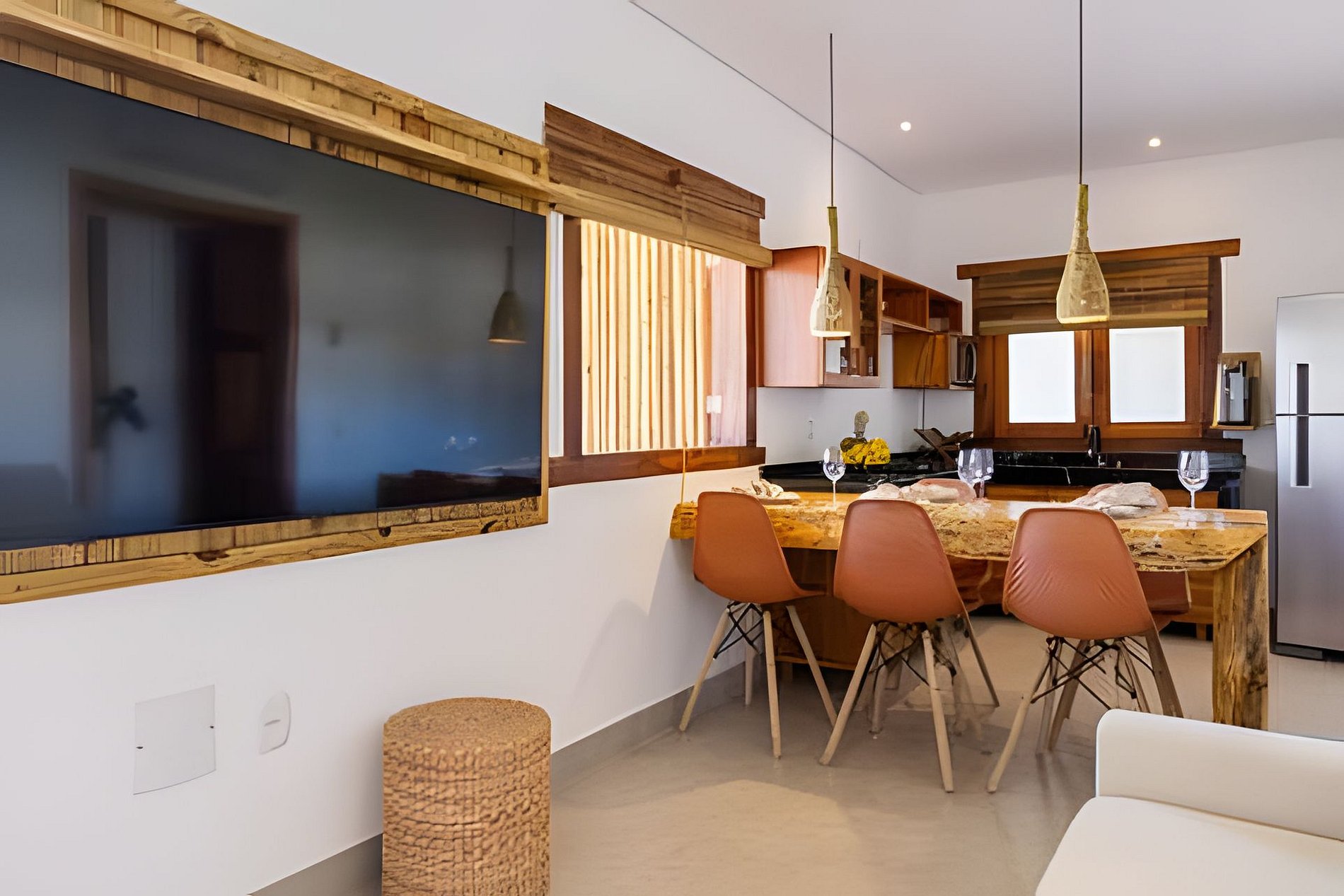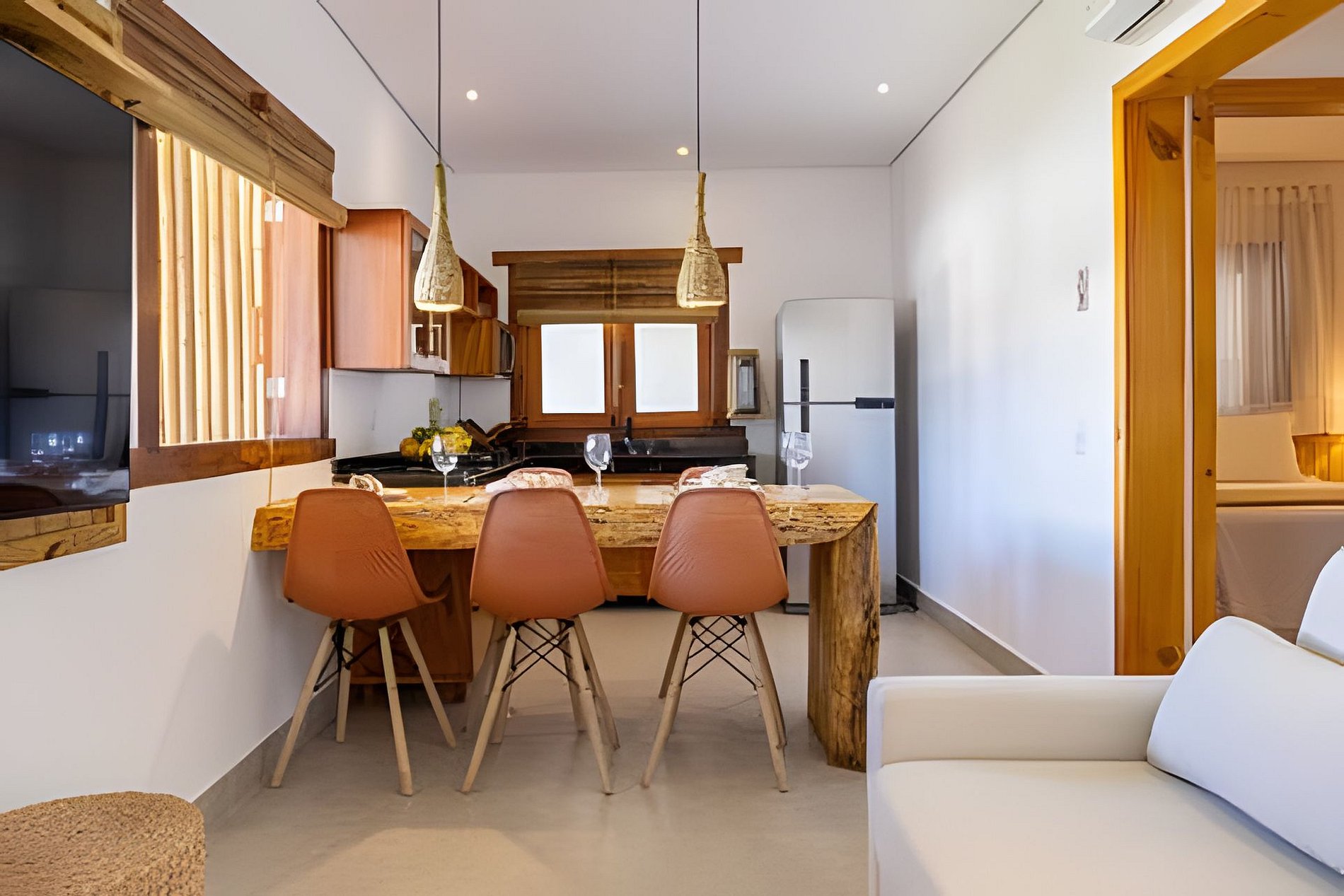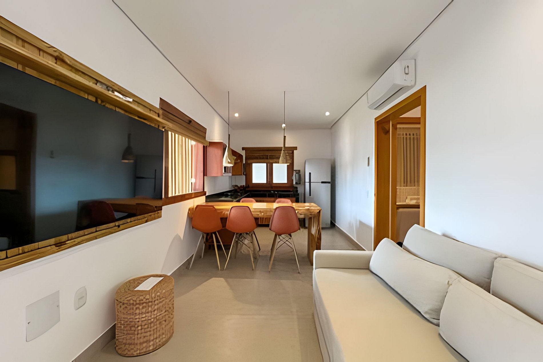 O apartamento possui dois quartos: um com cama queen e outro com cama de casal. A sala é ampla e confortável, equipada com sofá-cama e Smart TV. A cozinha é completa, com fogão, geladeira e utensílios que garantem praticidade durante a estadia. O banheiro é completo, conta com secador de cabelo e enxoval de qualidade. A decoração traduz a essência de Arraial d’Ajuda, criando um ambiente leve, acolhedor e autêntico.