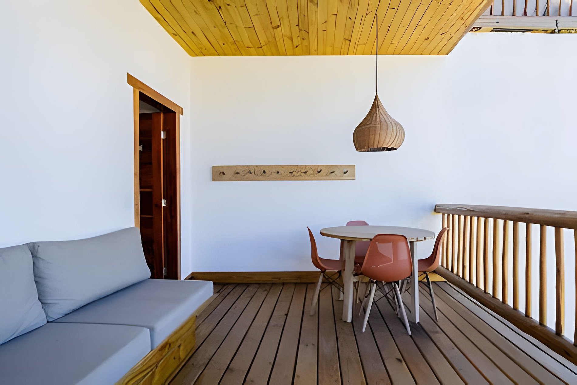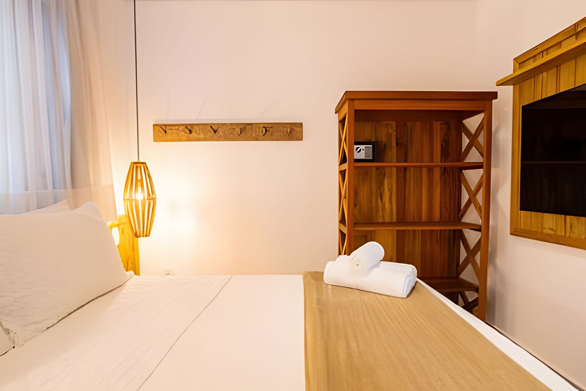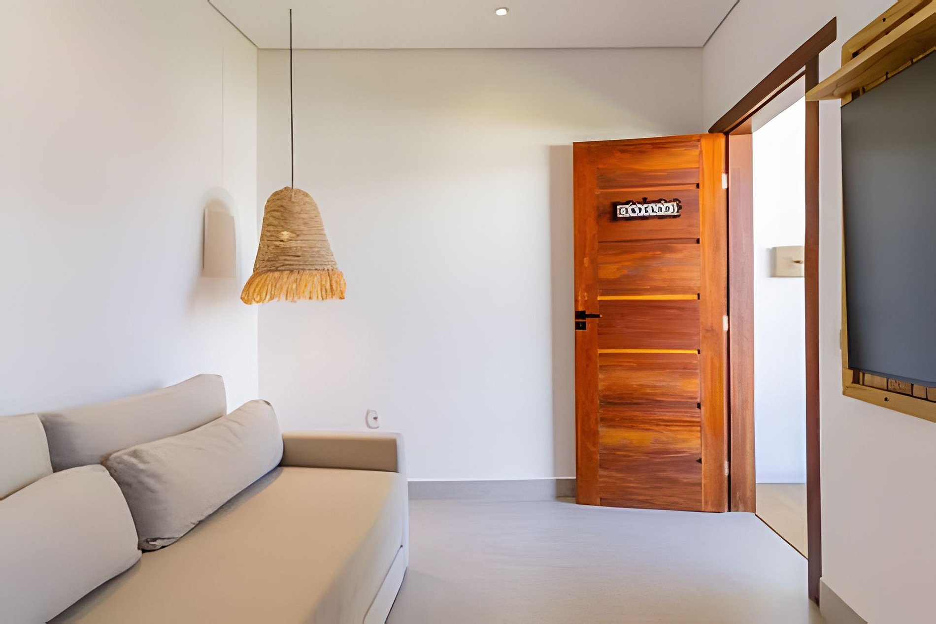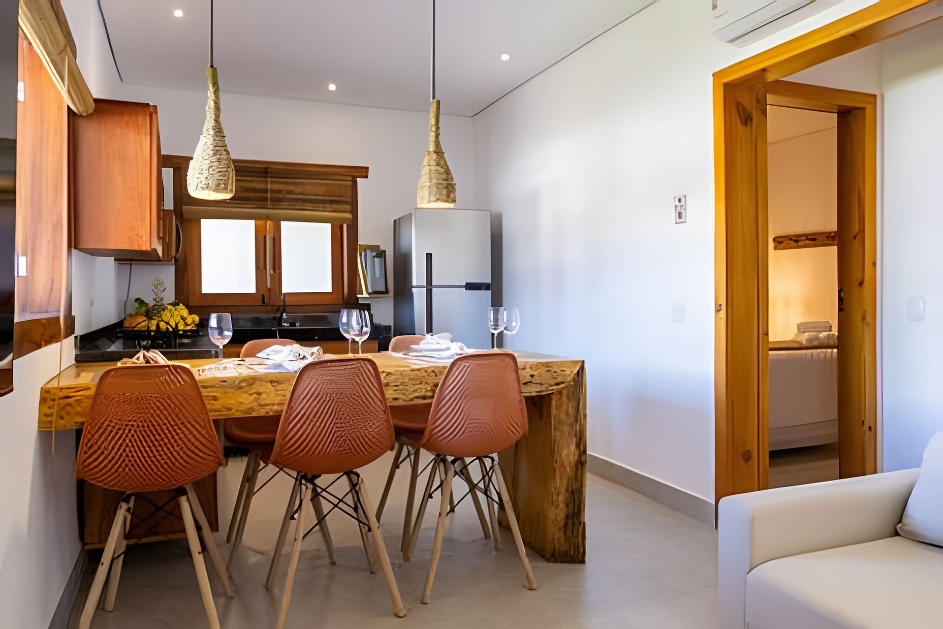 O apartamento possui dois quartos: um com cama queen e outro com cama de casal. A sala é ampla e confortável, equipada com sofá-cama e Smart TV. A cozinha é completa, com fogão, geladeira e utensílios que garantem praticidade durante a estadia. O banheiro é completo, conta com secador de cabelo e enxoval de qualidade. A decoração traduz a essência de Arraial d’Ajuda, criando um ambiente leve, acolhedor e autêntico.