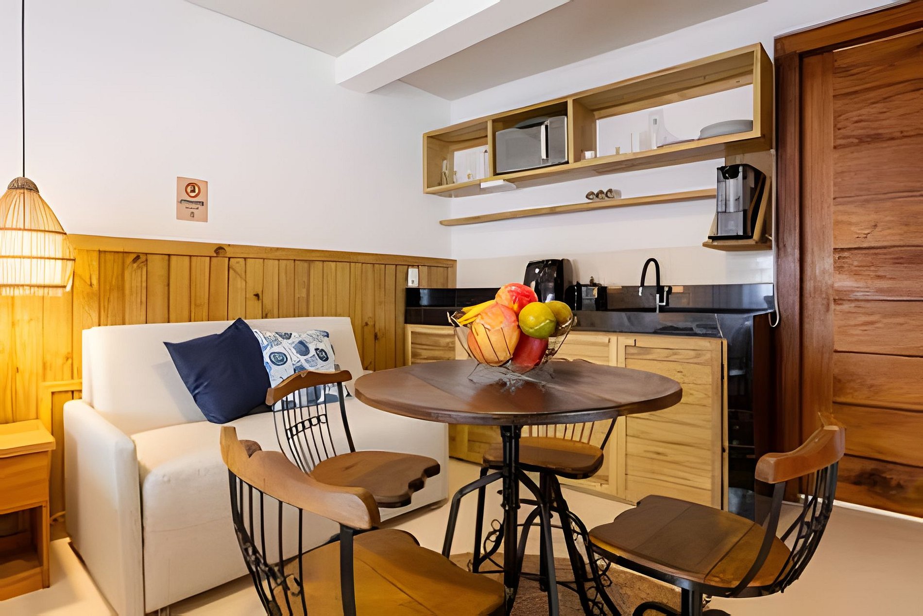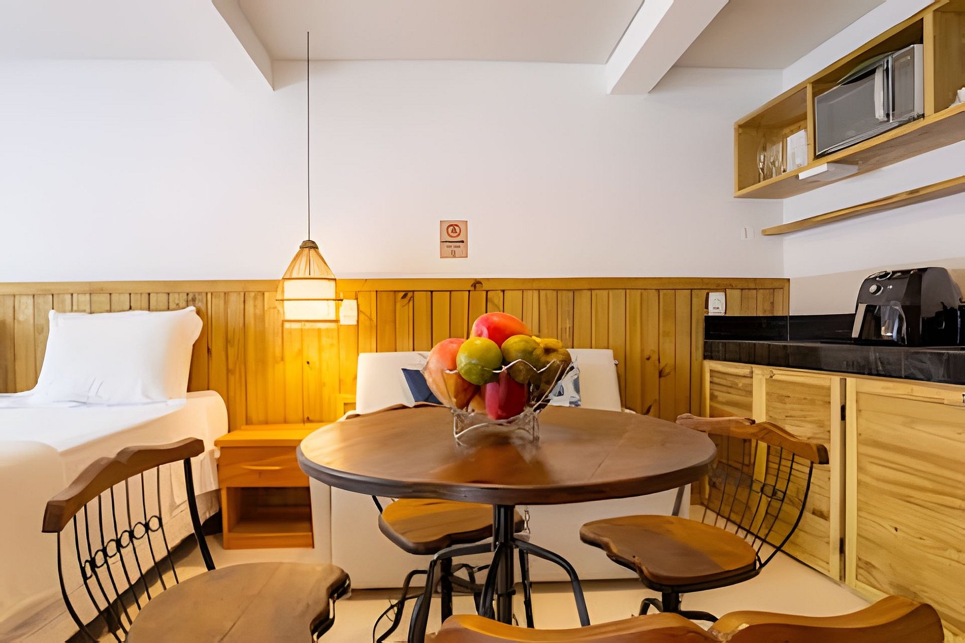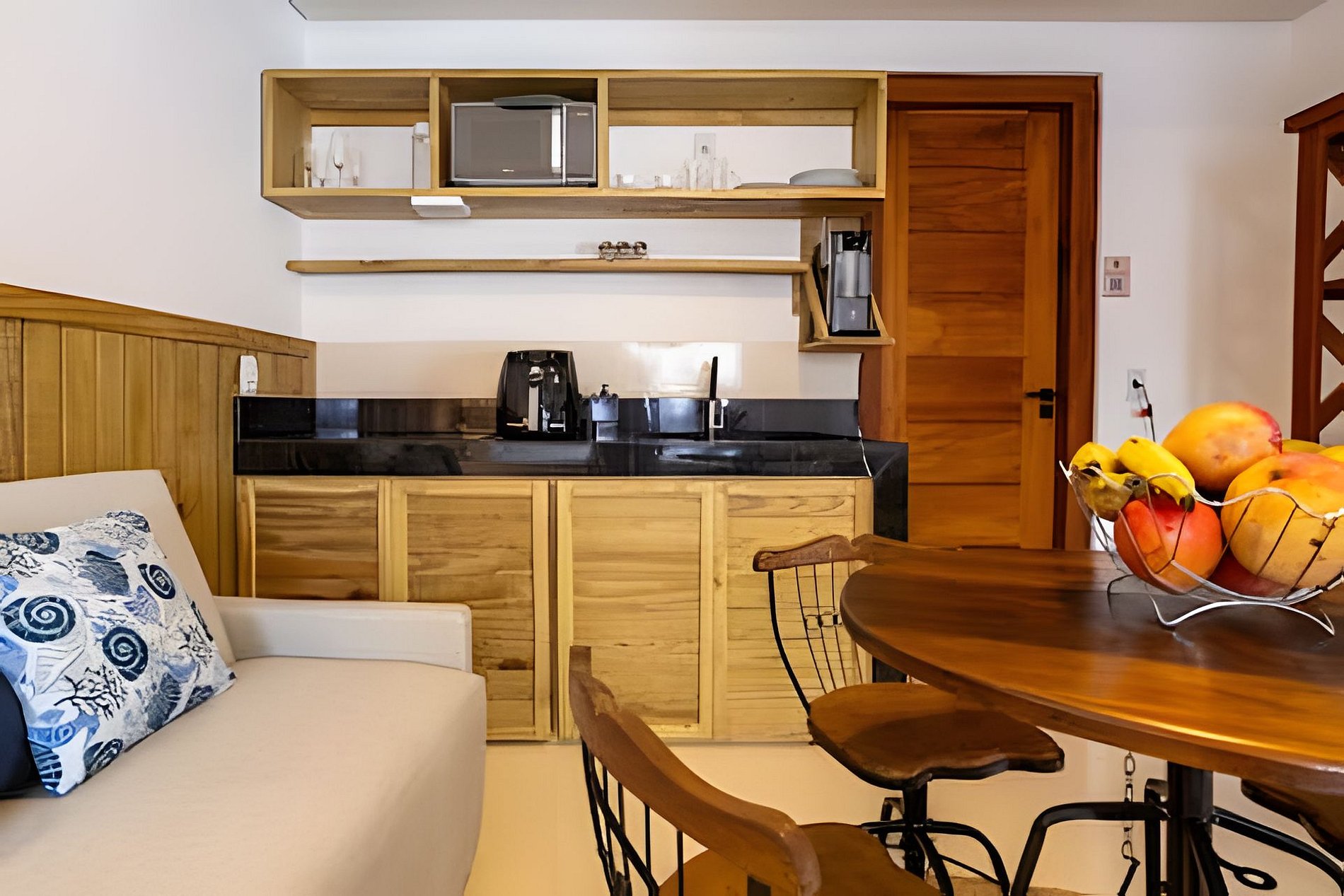 A decoração reflete o charme autêntico de Arraial d’Ajuda, criando um ambiente elegante e acolhedor. Para maior comodidade, o studio conta com serviço de arrumação em dias alternados, de segunda-feira a sábado, não incluindo a lavagem de louças. A troca de toalhas ocorre a cada três dias e a de roupas de cama a cada seis dias, sem custos adicionais. Mediante agendamento, o condomínio disponibiliza jacuzzi e espaço gourmet, serviços opcionais cobrados à parte.