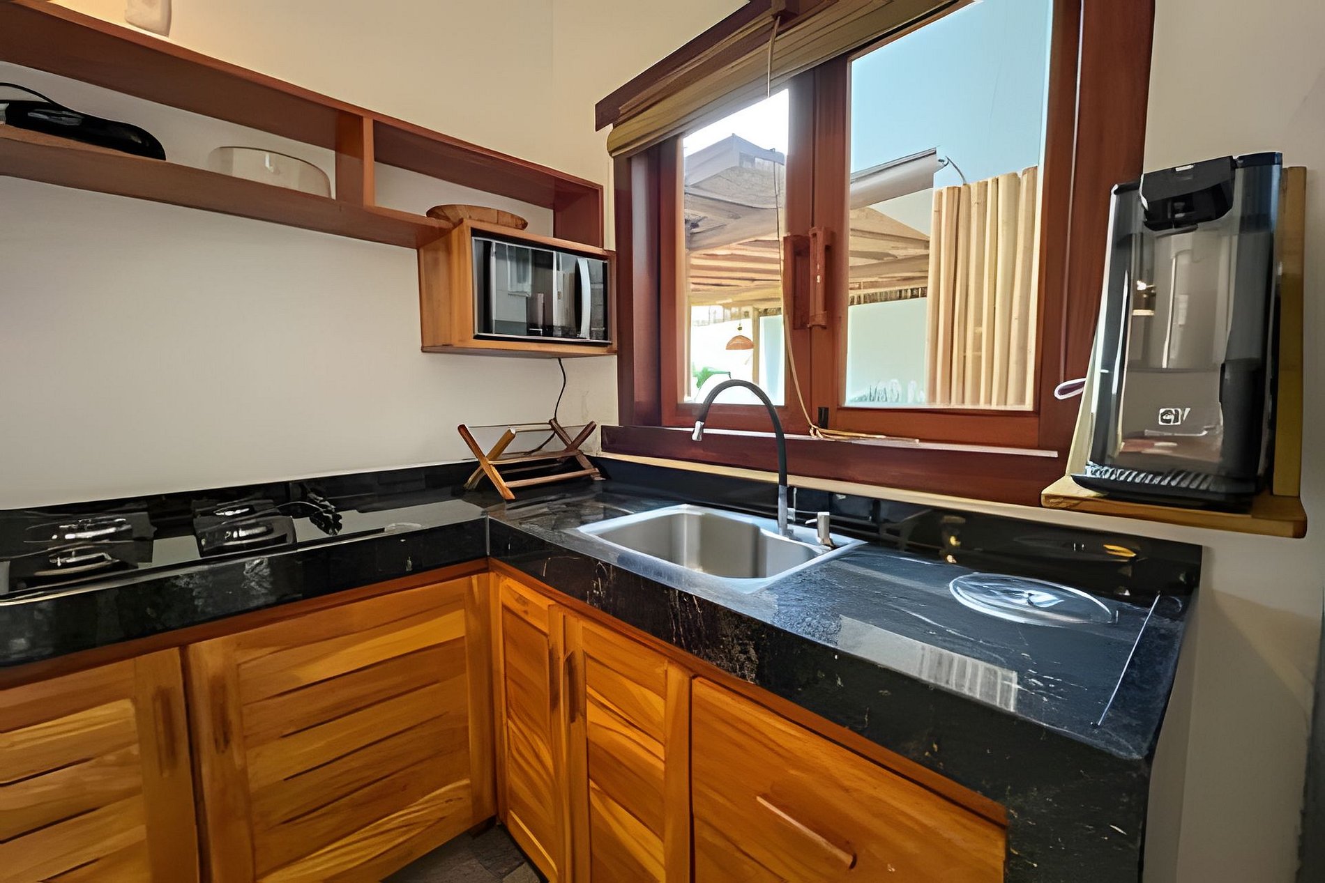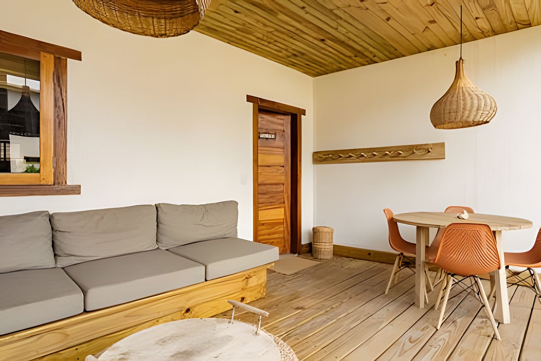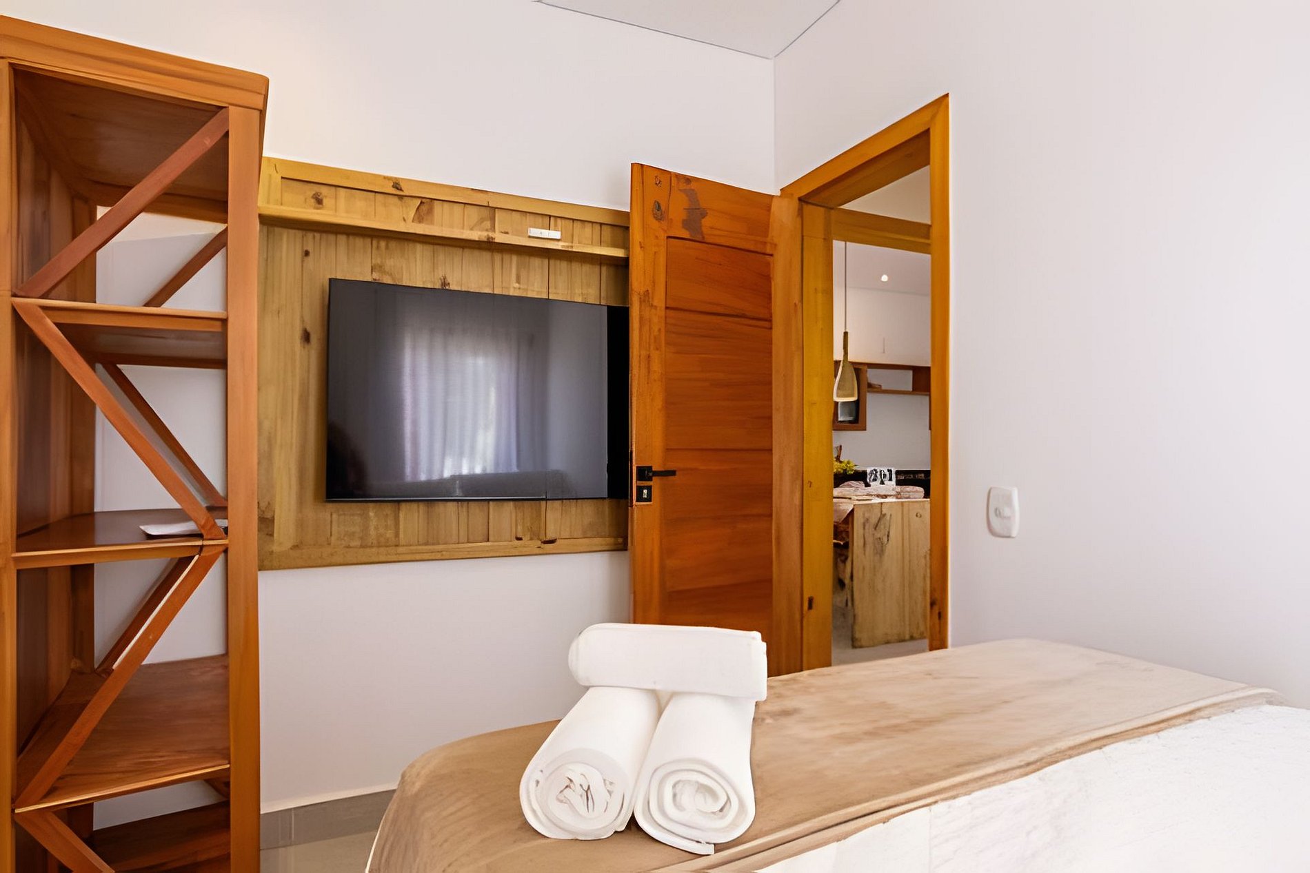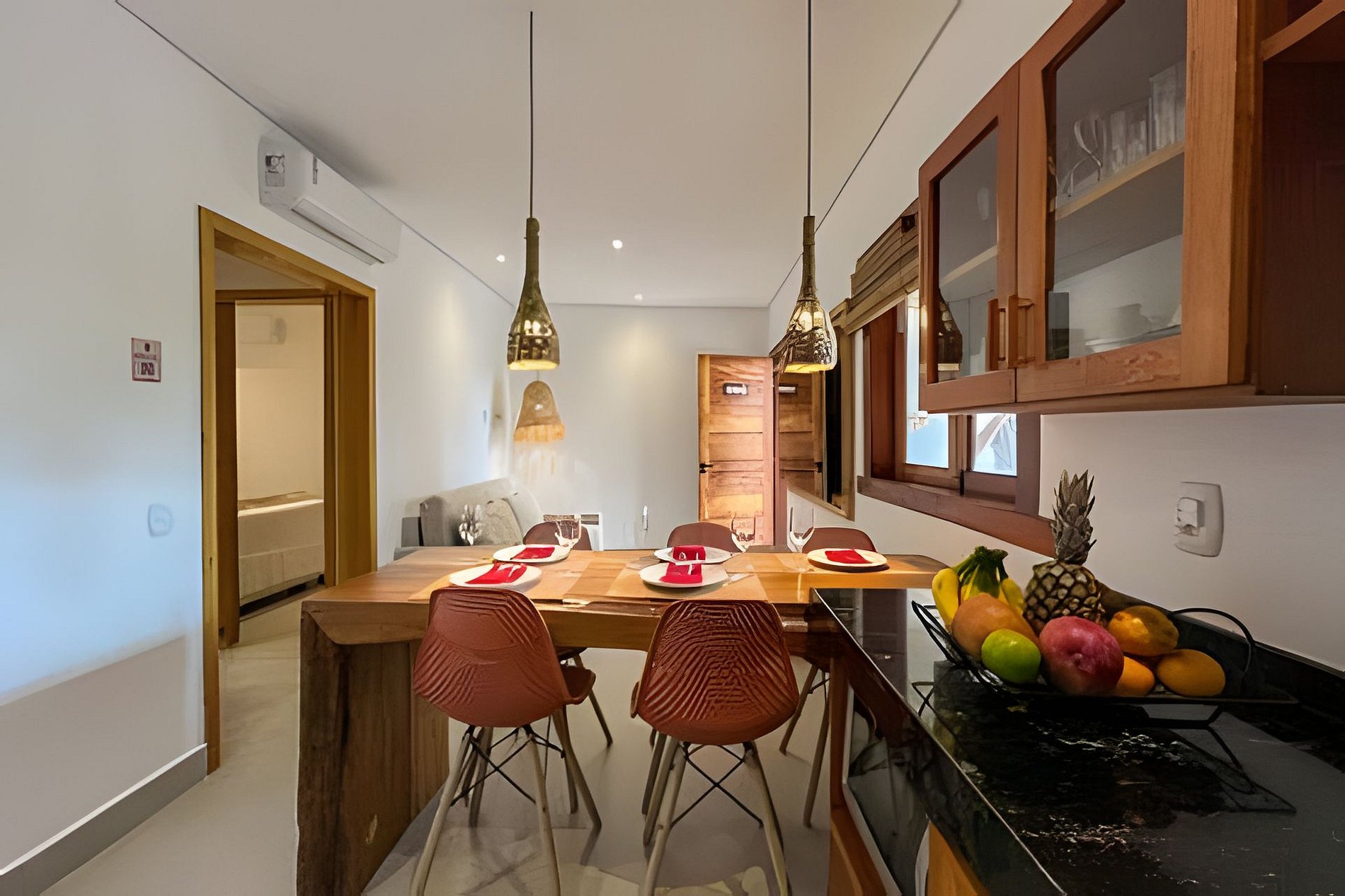 O apartamento possui dois quartos: um com cama queen e outro com cama de casal. A sala é ampla e confortável, equipada com sofá-cama e Smart TV. A cozinha é completa, com fogão, geladeira e utensílios que garantem praticidade durante a estadia. O banheiro é completo, conta com secador de cabelo e enxoval de qualidade. A decoração traduz a essência de Arraial d’Ajuda, criando um ambiente leve, acolhedor e autêntico.